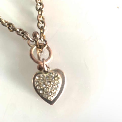 Selger her et smykkesett, kjede med lås og armbånd(med strikk). Begge er gullfarvet og har hjerteanheng med blanke stener. Svært pene og minimal slitasje, hvis noen, men dog brukt.