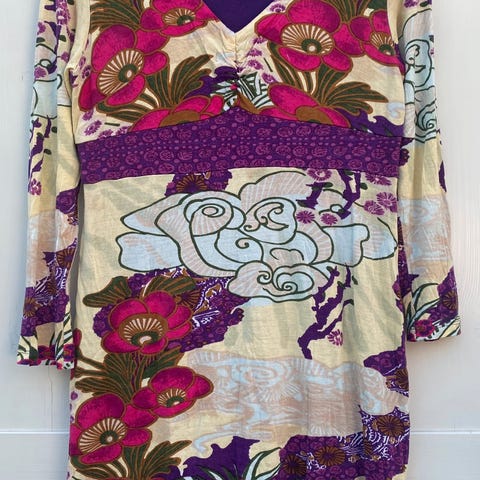 Pent brukt kjole, lite danset i. Formsydd, sitter veldig flatterende på. Markert som str XS, men passer S, men også en slank M. Splitt i begge sider, så kan også brukes til saidi. Gått opp litt i sømmen øverst i splitten på ene siden.