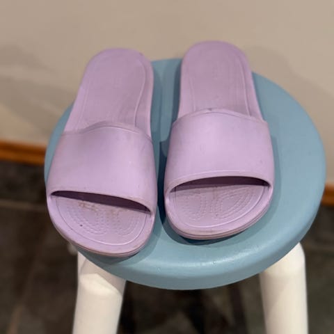 Recovery-sandaler fra amerikanske Vionics. Unisex-modell (herre 9,5, dame 11, amerikanske størrelser). Flip-flop-modell. Formet fotseng med tekstur, og godt polstret tåstropp. Tykk såle i EVA-skum. Fin farge - lys lilla og rosa.