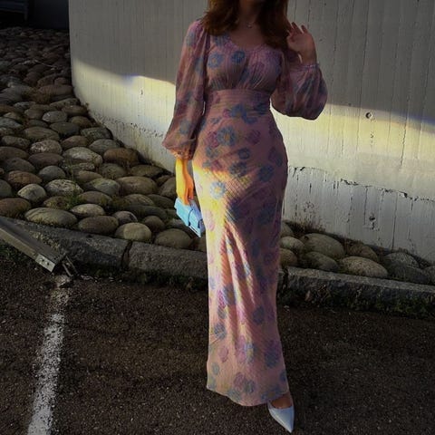 TiMo Ruffle er en nydelig lang kjole, Den har maxilengde, figursydd topp og et stort, volumiøst skjørt laget av volanger. Kjolen har stropper over skuldrene med volangdetaljer og rund hals. Størrelse S
