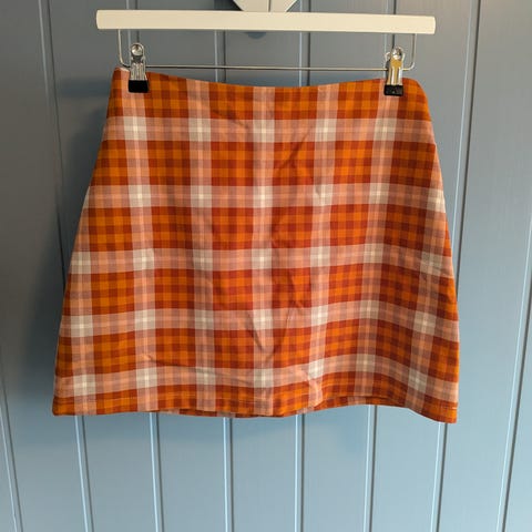 Rutet kort sommerlig skjørt i rødt/oransje/hvit / str 38 / HM/ bomullskrepp