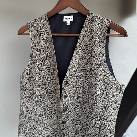 Flott vest med knyting bak, gullknapper foran, merke Nego Str S/M passer begge. Selges kr 100,-(11)