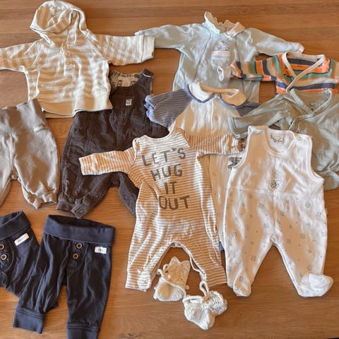 Klespakke til nyfødt gutt selges. Størrelse 50-56. Noen flekker kan forekomme, men ikke forsøkt fjernet.