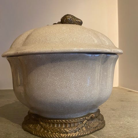 Suppe terrin, liten skade på lokket . Keramikk 800,-