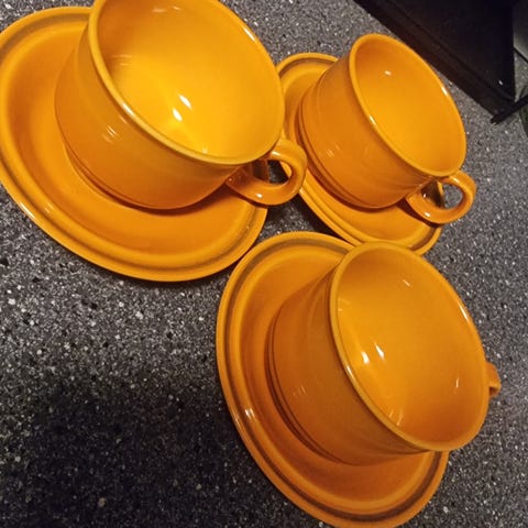 Tallerker og tefat i ulike størrelser. To kopper. Veldig blanke og fine. Ikke krakkelert, framstår som lite slitt.