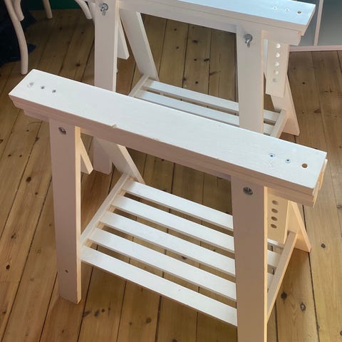 Vi har fått inn for salg en hvit lakkert krakk til bordplate ? mål B45 L 70 H 70+20 cm.