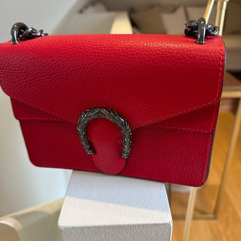 Lufter interessen for min fantastisk fine Gucci Dionysus med Swarovski-krystaller. Vesken kommer med dustbag og kvittering. Den er veldig pent brukt og godt tatt vare på (har et lite sminkemerke inne i vesken på stoffet, kan sende bilde). Ellers i utmerket stand. En veske som virkelig tåler det meste og som ikke lett får skraper eller merker. Vesken er ikke lenger i salg i rød hos Gucci.