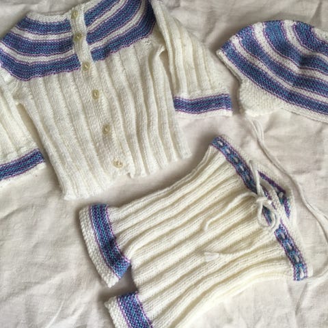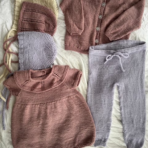 Helt nytt strikkesett fra Du Store Alpakka, strikket i Baby Silk. Bleiebukse, sokker og to luer.