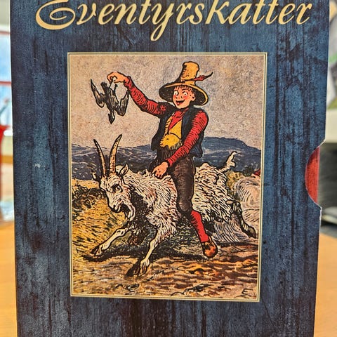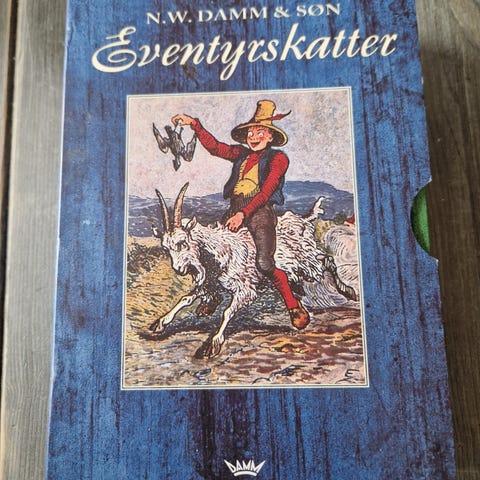 Grimms eventyr, fortellinger fra tusen og en natt, Asbjørnsen og Moe eventyr for barn og HC Andersen eventyr. En av bøkene er av et annet format, og passer følgelig ikke inn i boksen. Men det er den samme boken.