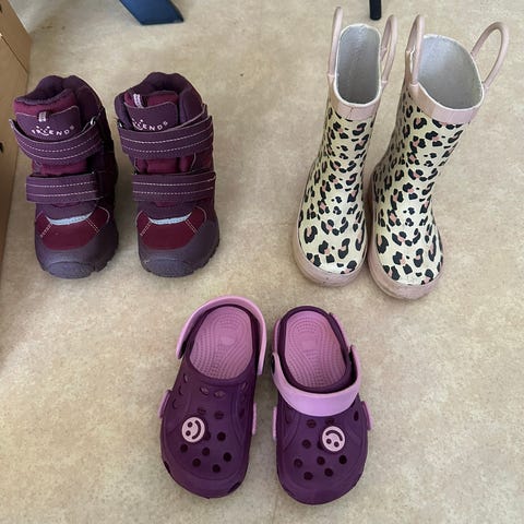 Disse ble kjøpt for å overraske mannen for graviditet og har ikke blitt brukt til barnet. Vi glemte helt ut at vi hadde sko liggende hjemme og når vi kom på det, var det forsent😅