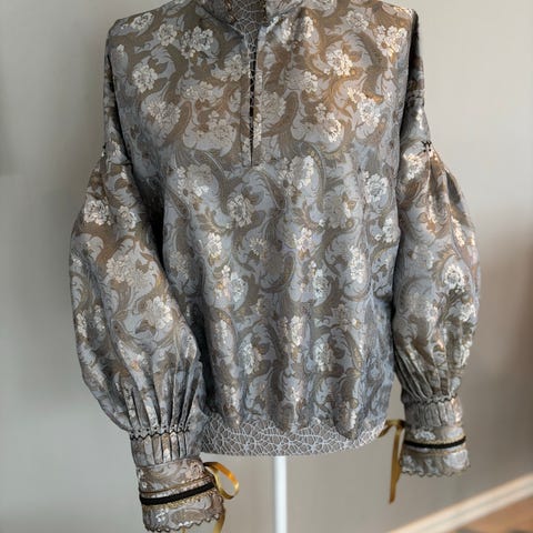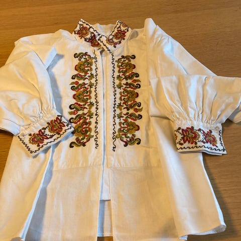 Utenpåtrøye til beltestakk. Jakken er sydd i ullstoff med brodert nederst på erme. Kantene rundt er det sydd inn grønt ullstoff som er en fin detalj.Brystvidde er fra 100-104