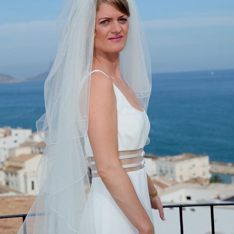 Agape brudekjole med perler, broderier, langt slep og langt slør(kan sløyfes). Snøring i ryggen.
