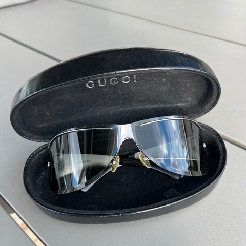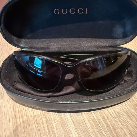 Tøff vintage solbrille fra Gucci. Et lite hakk nederst på ene glasset og et par små riper. Ellers hele og fine. Etui følger med. Kan sende med Postnord til 69,-. Se også mine andre annonser ved å klikke på navnet mitt. Mye fint både gammelt og nytt til bra priser.