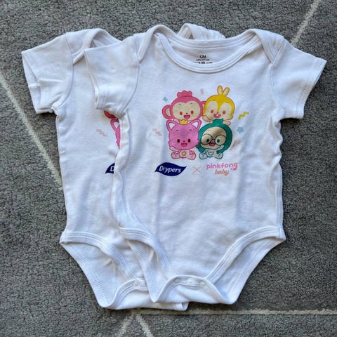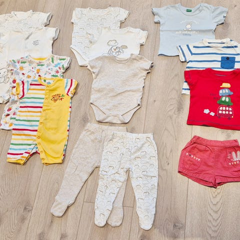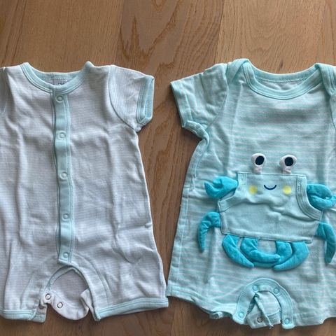 Klespakken består av playsuit fra Polarn O. Pyret og singlet body fra Kappahl. Trykknapper mellom beina for enklere bleieskift.