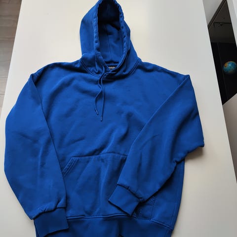 Merke: Abercrombie & Fitch. Blå med hvite og sorte detaljer. 60% bomull, 40% polyester. Normalt brukt.