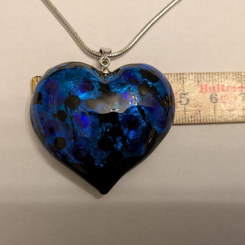 Nydelig glass (håndlaged(blåst) hjerte (3 cm)med lærreim 45 cm. Låsen er i sølv og kan reguleres. Som nytt.