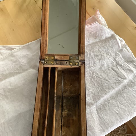 Et nydelig flott barber skrin med utskjæringer og innhold.