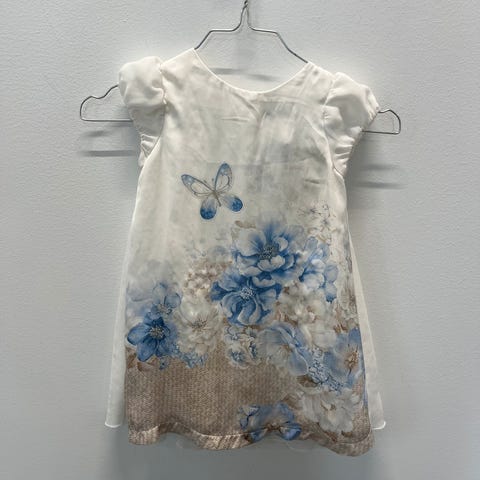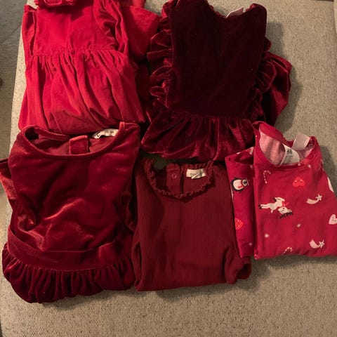 En kjole størrelse 104 den andre i størrelse 110/116. Pysjen er i størrelse 92. Det er noen små flekker på det hvite på den ene armen på pysjen.