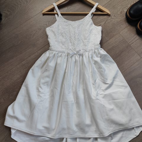 Vakker hvit barnekjole med paljetter. Glidelås på ryggen. Pent brukt en gang uten noen bruksmerker.