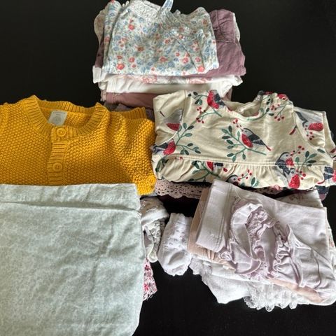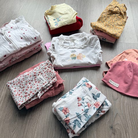 Selger en nydelig liten klespakke med body fra Petit Bateau, lett bomullsbukse fra Mexx og solhatt fra H&M i Libert mønster i matchende farger.