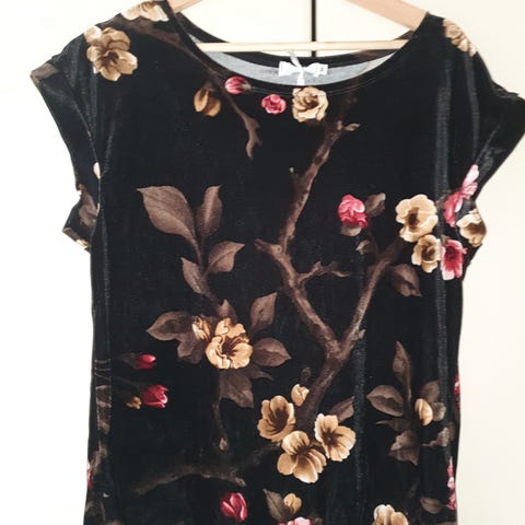 Pent brukt bluse med innsving i livet, og som svinger ut i vollang fasong fra livet. Knytning bak.