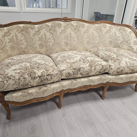 Pen og romantisk rokokko fransk stil to seter sofa med nye stoff fra 1800 tallet.Ingen flekker. Pen bruk og i godt stand. Brukte som pynt møbler i butikken i Telemark.Putene ikke inkludert i prisen.