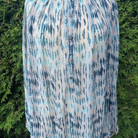 Bluse fra NoaNoa, str 42. Lengde : 64cm, brystvidde : 54cm fra armhule til armhule. Armløs, rund hals, påsatte rysjer. Farger: offwhite, grønn, gul-orange. Kvalitet 100% viskose. Brukt én gang, selges 350kr