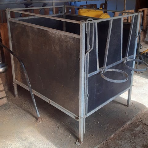 Frittstående, flyttbar kalvebinge selges. Plass til 2 småkalver. Galvanisert rørkonstruksjon (luftig, ut-/innsyn, ‘reinslig’), ‘spaltegulv’ av treplank (enkel reingjøring og ev utskiftning), bøtteholdere. Solid, hel og fin.