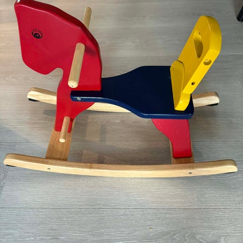 Koselig og fin malt gyngehest i tre. Stødig og fin, ungene har elsket den!