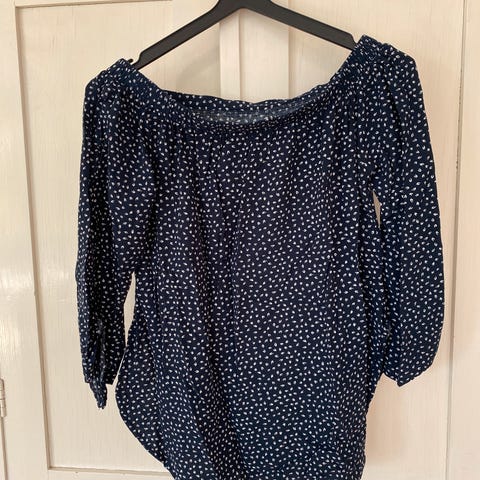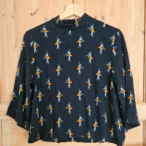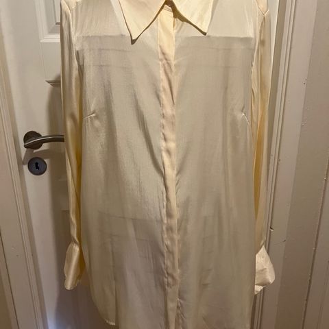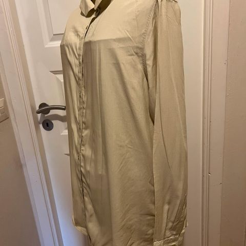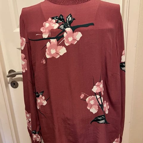 Ny mønstret viskosebluse fra HM. Størrelse large. Vanlig i størrelsen. Lengde: 63cm. Vid rynket arm . Stram mansjett med trukne knapper i samme stoff som blusen. Kant i halsen, knepping bak. Farger : multi ( svart, grønn, gul) . Selges 150kr