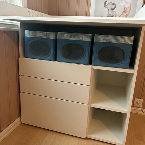 Hvit kasse med hjul fra Jabadabadoo selges kr 150. Ny pris 399. Noen flekker her og der og kan ha godt av et strøk maling.