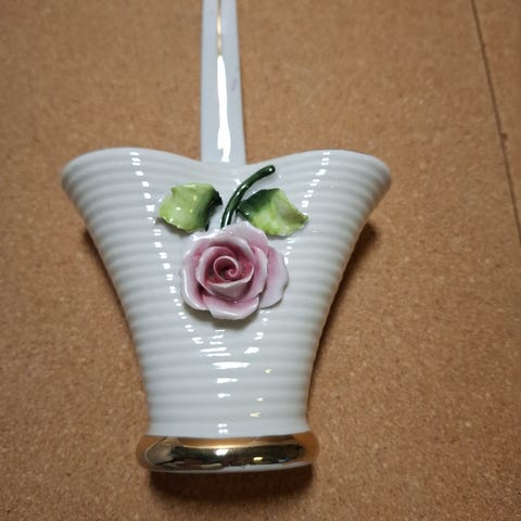 Koselig liten hvit "ruglete" gammel vase med søte blomster. 9,5cm høy