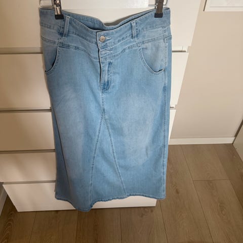 Pent og svært lite brukt skjørt i svart dongreystoff til dame i Str. Medium. Hel lengde er 50 cm. Mål rundt linningen er 80.