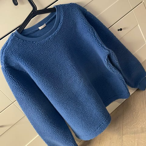 Stoffet er tykt og litt glatt, med et stilig stripemønster, som du kan se på bildet. Det er en kjempekul genser, så jeg ønsker bare å selge den fordi jeg ikke får brukt den.