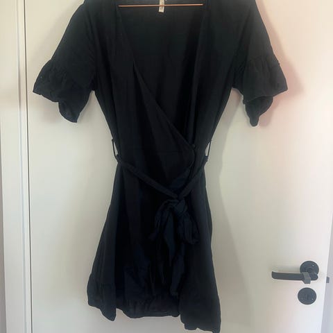 Fin wrap-kjole med knyting i livet og søte volanger nederst og langs ermene.