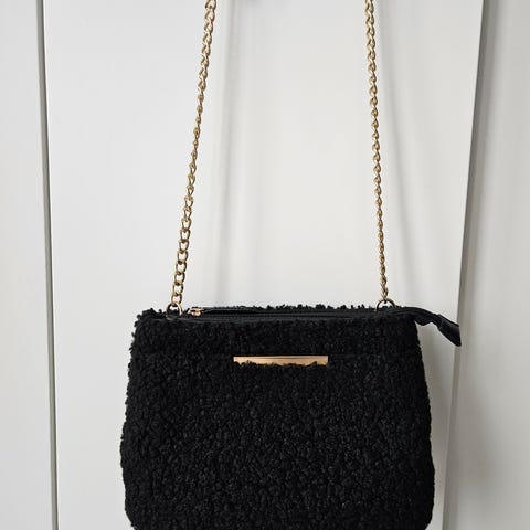 Nydelig selskapsveske m sorte paljetter og gull detaljer .