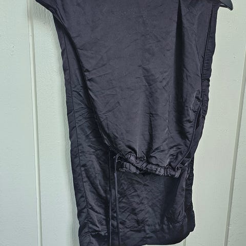 pyjamasbukse med hvite prikker i 100% viskose. Kortere modell. Strikk i livet. Merket str. M fra H&M men stor i størrelsen og passer bedre str. L. Midje måler ca. 43 cm x 2 og kan strekkes til ca. 53 cm x 2. Innerbeinslengde ca. 59 cm. Brukt en gang.