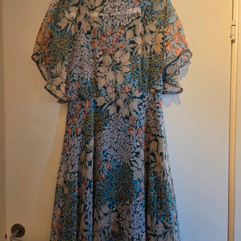 Særpreget blomstrete kjole med lavt liv med sløyfe i siden. Ingen glidelås. Underkjoler og delvis bar ryggåpning med knapp i nakken. Merke: Mone 🤎🌸🤎 Kan hentes i Oslo eller sendes. Kjøper betaler porto