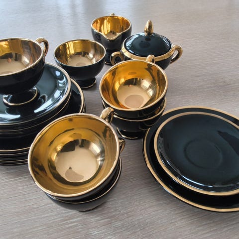 Fra ulike fabrikanter, men liten forskjell så de går fint sammen som ett service. Selges samlet for 700,-