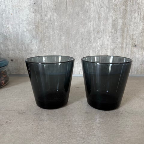 Søkeord: retro, retrokjøkken, vintage, glass, drikkeglass, melkeglass, saftglass, sort, svart, sotet glass, røkt glass.
