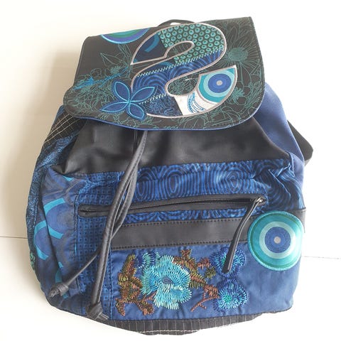 Sekk i etnisk mønster, håndlaget i Ecuador. 38 cm høy. Liten lomme på framsiden.