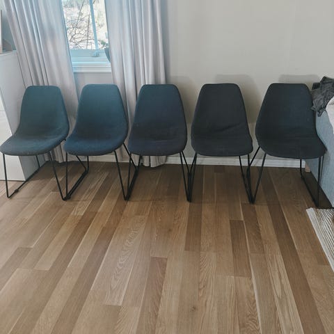 Stoler til f.eks spisestue. Stolene er produsert i Østen. Noe skade på setet på den ene stolen og i treverket på den andre stolen. 2 av stolene er uten skade.
