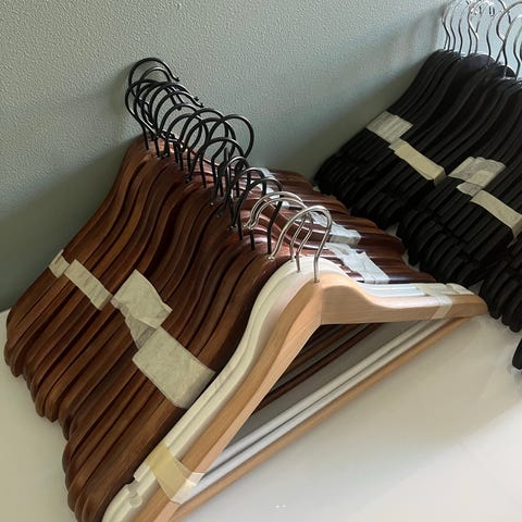 Selger 9 stk gamle tre kleshengere med firmalogo. 7 stk fra Fredrikstad butikker