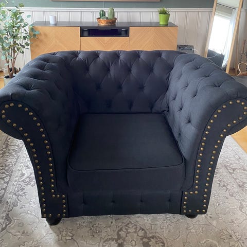Antrasithe Velvet stol med sølvnagler, høyde 75cm, bredde 108cm, dybde 104cm