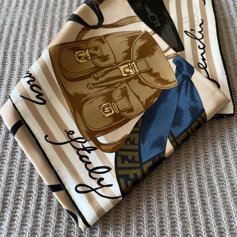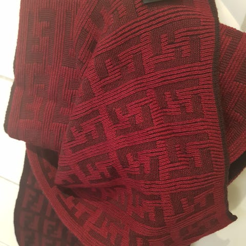 Fikk dette til jul. Forsto ikke hva Fendi var den gangen, så lappen ble klippet av, derfor lite hull, men skjerfet ble aldri brukt.