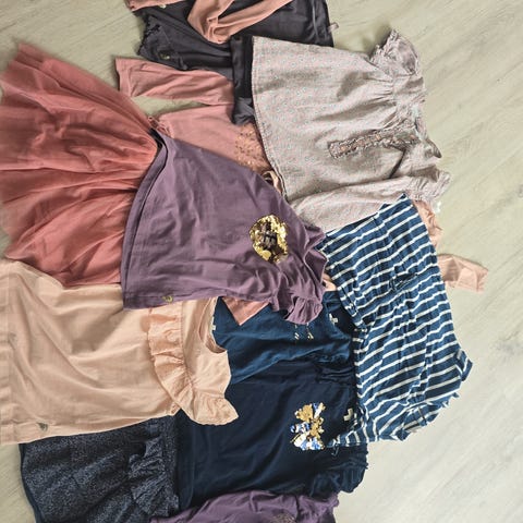 Klespakke 8 plagg, (3 plagg fra Pompdelux, 1 genser fra Name it, 1 kjole fra Blue Seven, fleece jakke fra Bergans) pent brukt. Kan sendes.