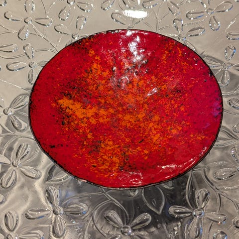 Dekorativt fat i kobber med emalje. Dette er «Mars» i en serie av planeter av John Godheim i Kobbart.
