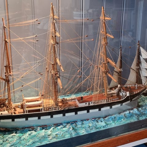model av hmrs. BOUNTY i stort glassmonter mål. l.h.b.105. 40. 80cm.