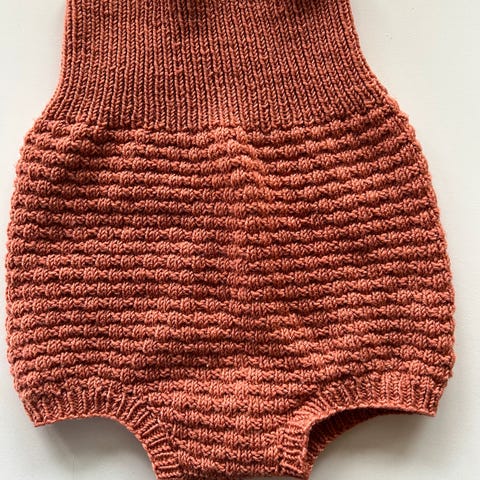 Hjemmestrikket romper selges. Den er strikket i Mandarin Medi, 100% bomull. Et mykt og delikat garn som er velegnet til babyklær. Kan vaskes på 60 grader.