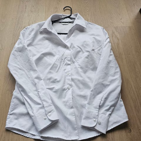 Hvit skjorte med litt sorte detaljer. Lite brukt Mål: Hel.L foran 66cm, Hel.L bak 75 cm. Bredde 56×2 cm .veldig fin på.